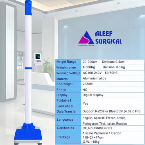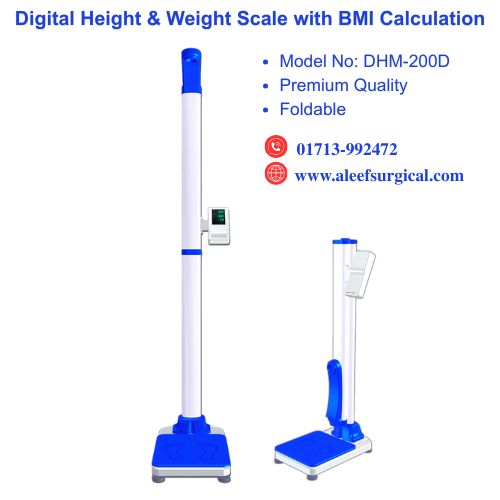Digital Height and Weight Scale with BMI Calculation Electronic body scale is controlled by a microcomputer. This machine can automatically print and measure body height, weight, voice broadcast and measurement results. This machine adopts an ultrasonic detector and sophisticated weight sensor, which makes the results more precise. Our reliable quality guarantee and perfect after-sales service make our machines the best choice in hospitals, schools, gymnasiums and various public places. Aleef Surgical in Bangladesh is directly importing from China and supplying Bangladesh at a very low price. Providing sales services with skilled manpower. Buy these from Aleef Surgical for your hospital or home office,